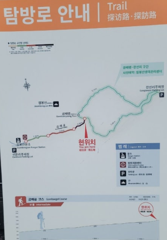 탐방로는 초반 완만한 숲길, 이후 중간 경사 구간, 마지막 능선부로 구성되어 있으며